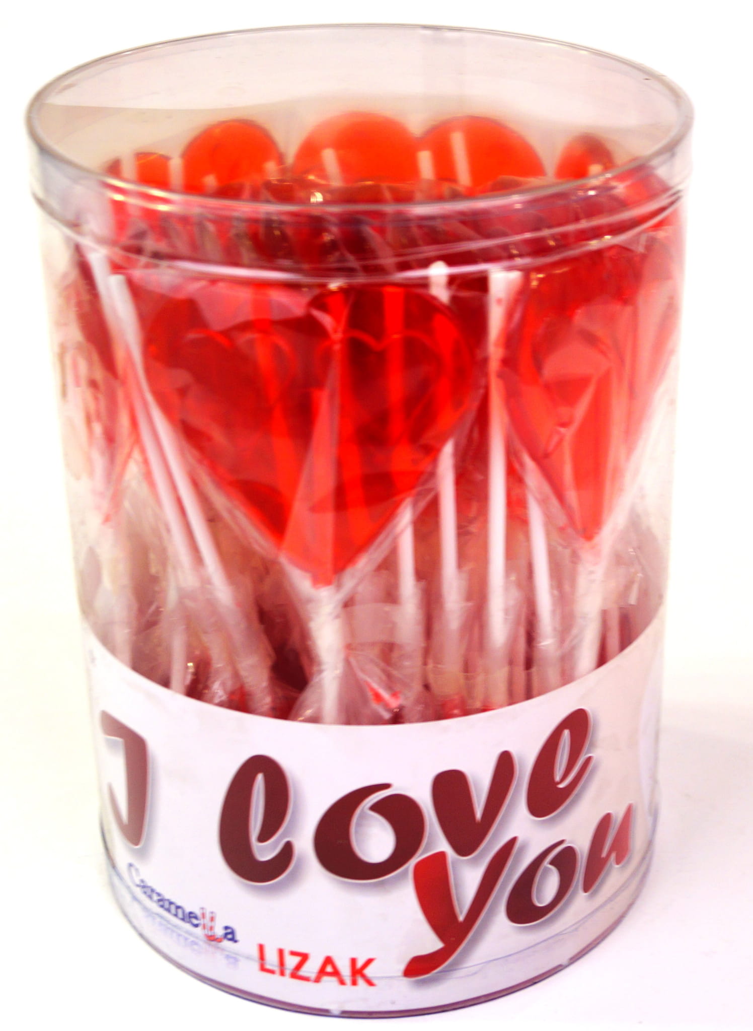 Super smaczne lizaki w kształcie serca o smaku owocowym. Każdy lizak pakowany w osobny papierek. Waga jednego lizaka 30 g. Długość lizaka wraz z patykiem 18 cm. Szerokość serca ok: 7 cm, wysokość: 7 cm. Wyprodukowano w Polsce.
