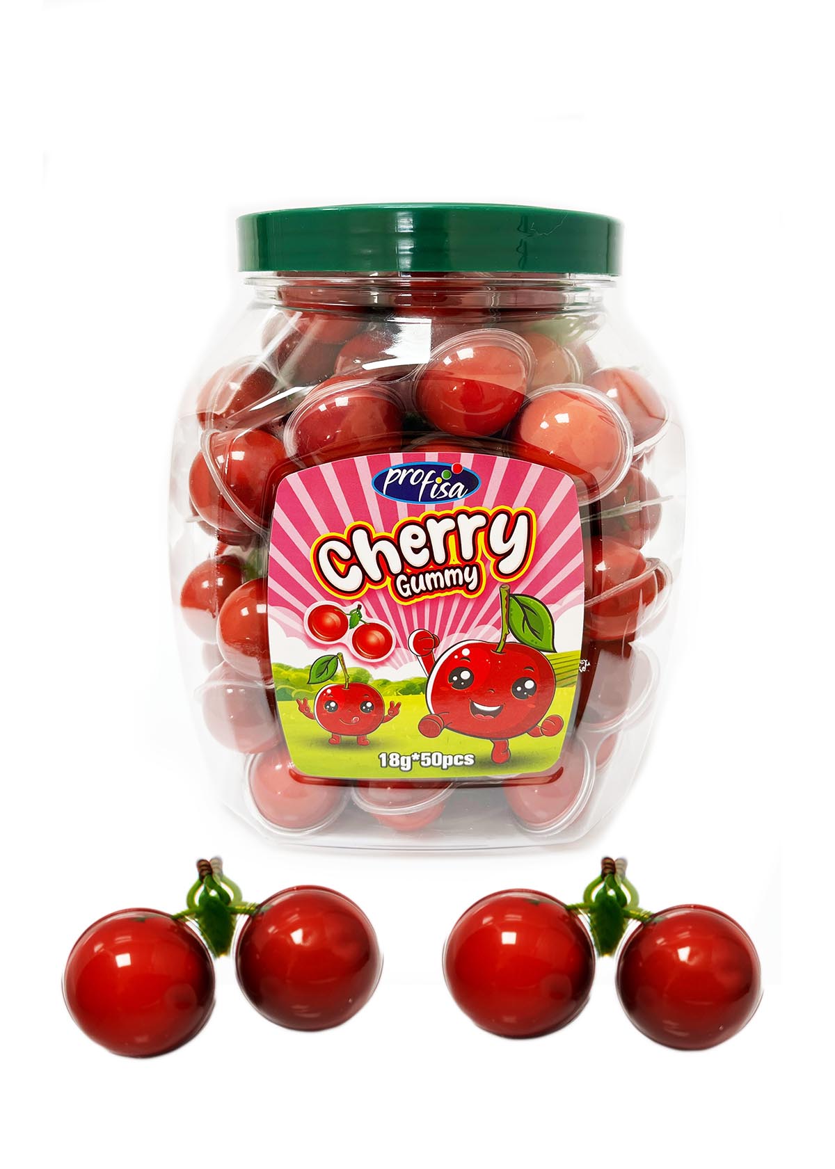 Żelki pakowane osobno w plastikowe pudełeczko, które kształtem przypomina wisienkę.