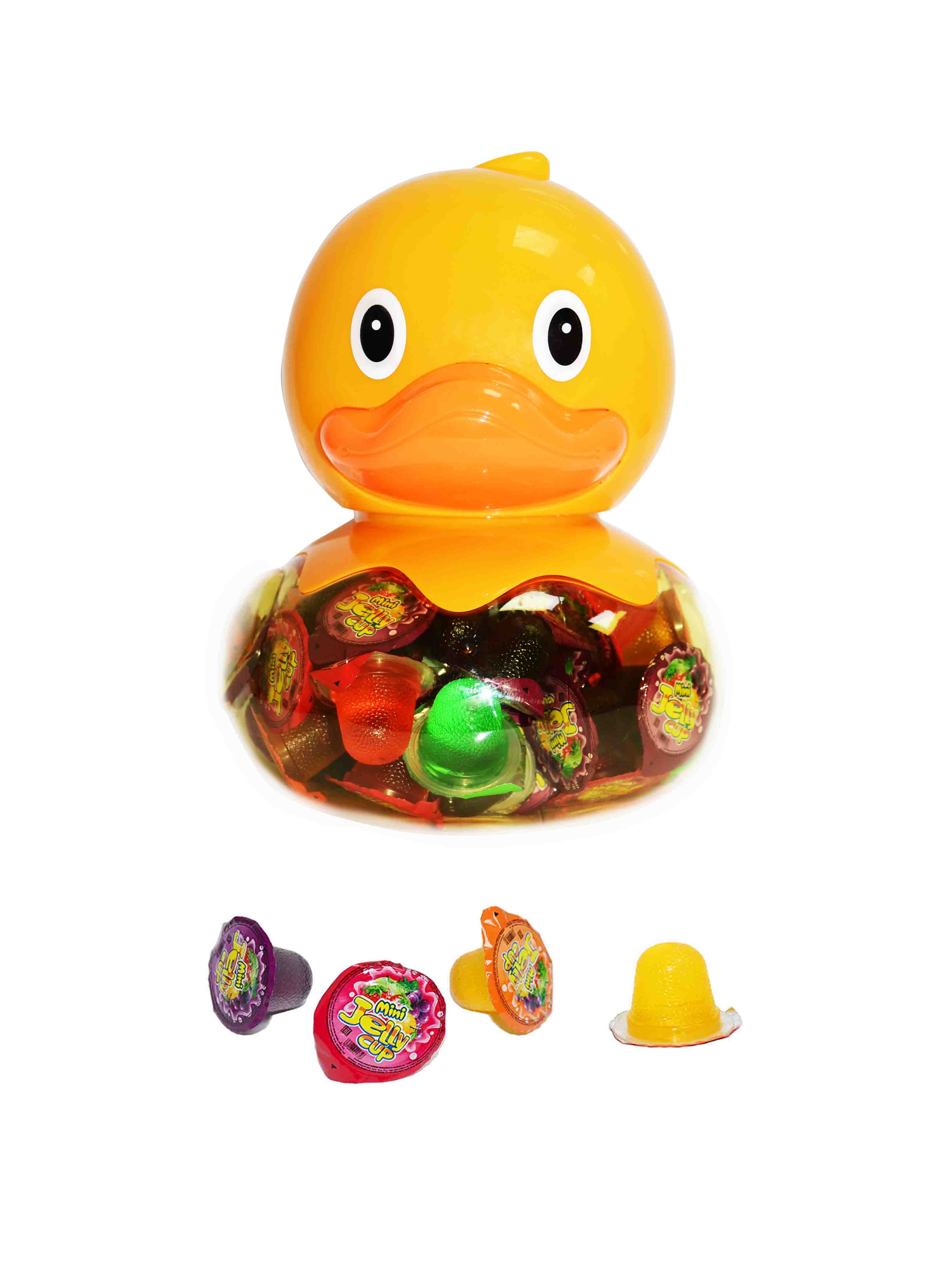 Pyszne rozpływające się w ustach żelki o smaku owocowym zamknięte w opakowaniu zbiorczym przypominającym pomarańczową lub żółtą kaczuszkę - skarbonka.