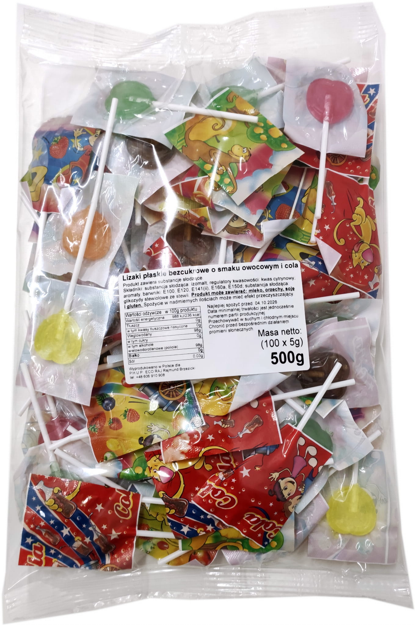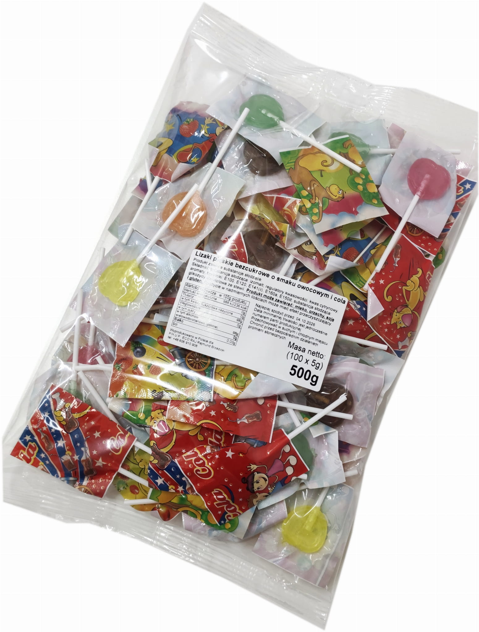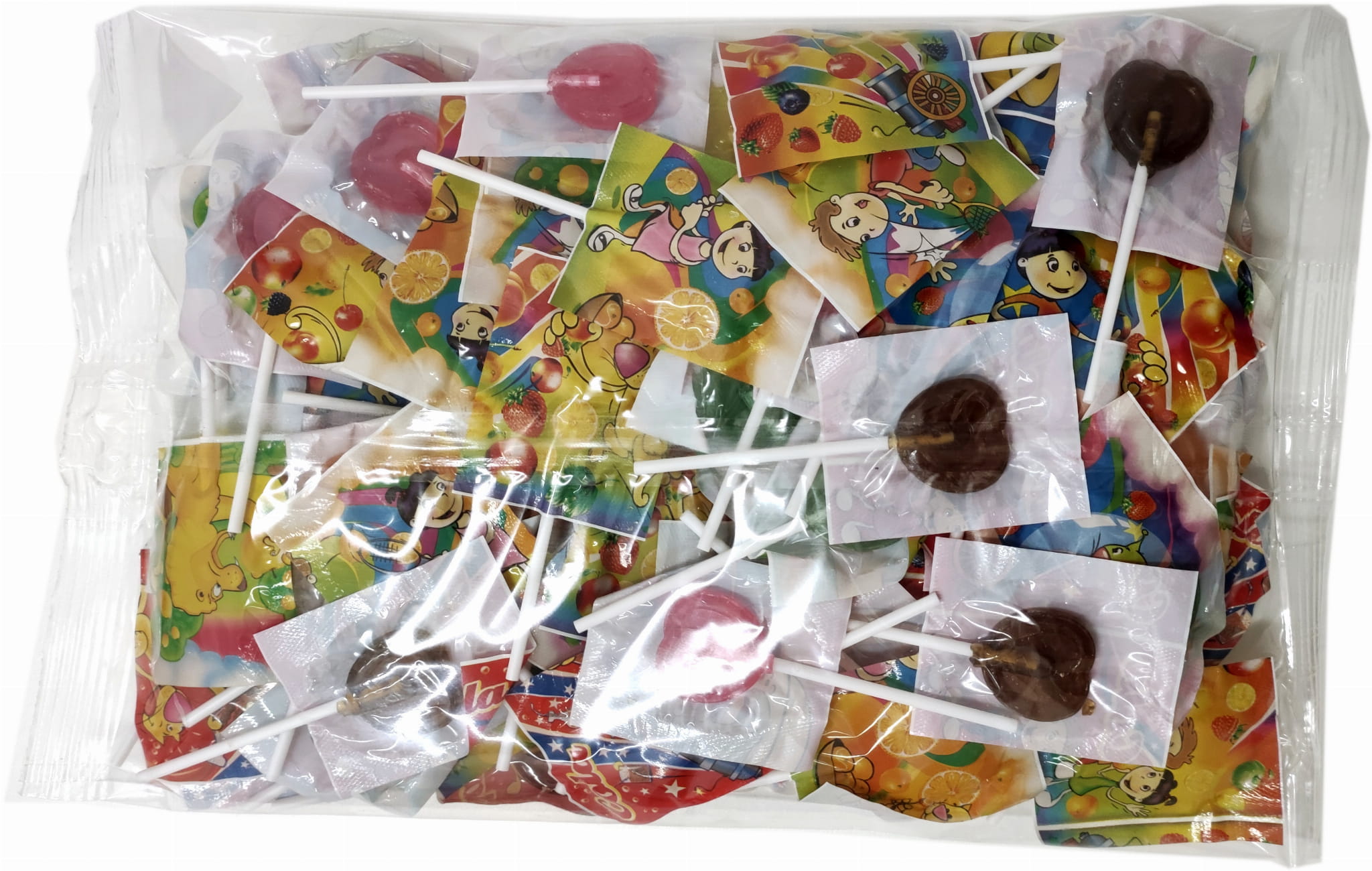 Każdy lizak pakowany w osobny papierek z zabawną grafiką.