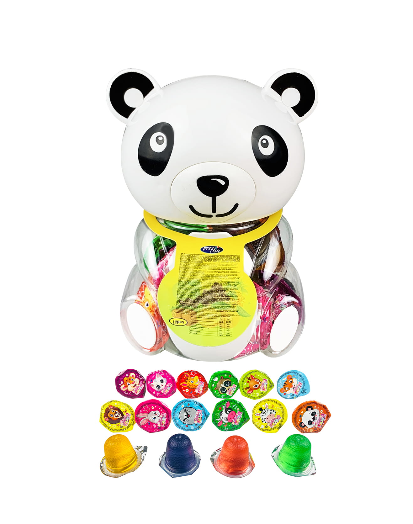 Pyszne rozpływające się w ustach żelki o smaku owocowym zamknięte w opakowaniu zbiorczym przypominającym pandę - skarbonka.