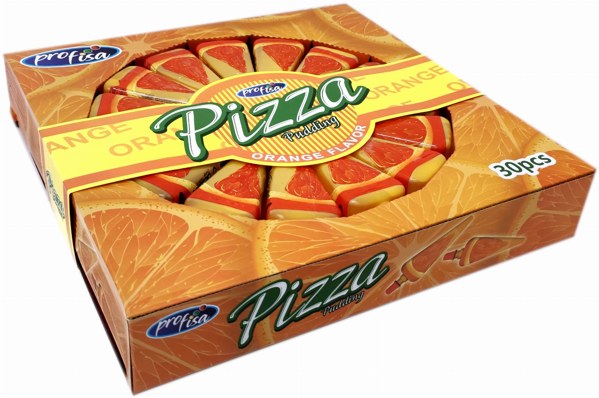 Pyszne rozpływające się w ustach galaretki o smaku pomarańczowym zamknięte w plastikowych opakowaniach, które kształtem przypominają trójkątne kawałeczki pizzy. W opakowaniu zbiorczym znajdziemy 30 sztuk galaretek - zapakowanych w karton tworząc imitacje pizzy.