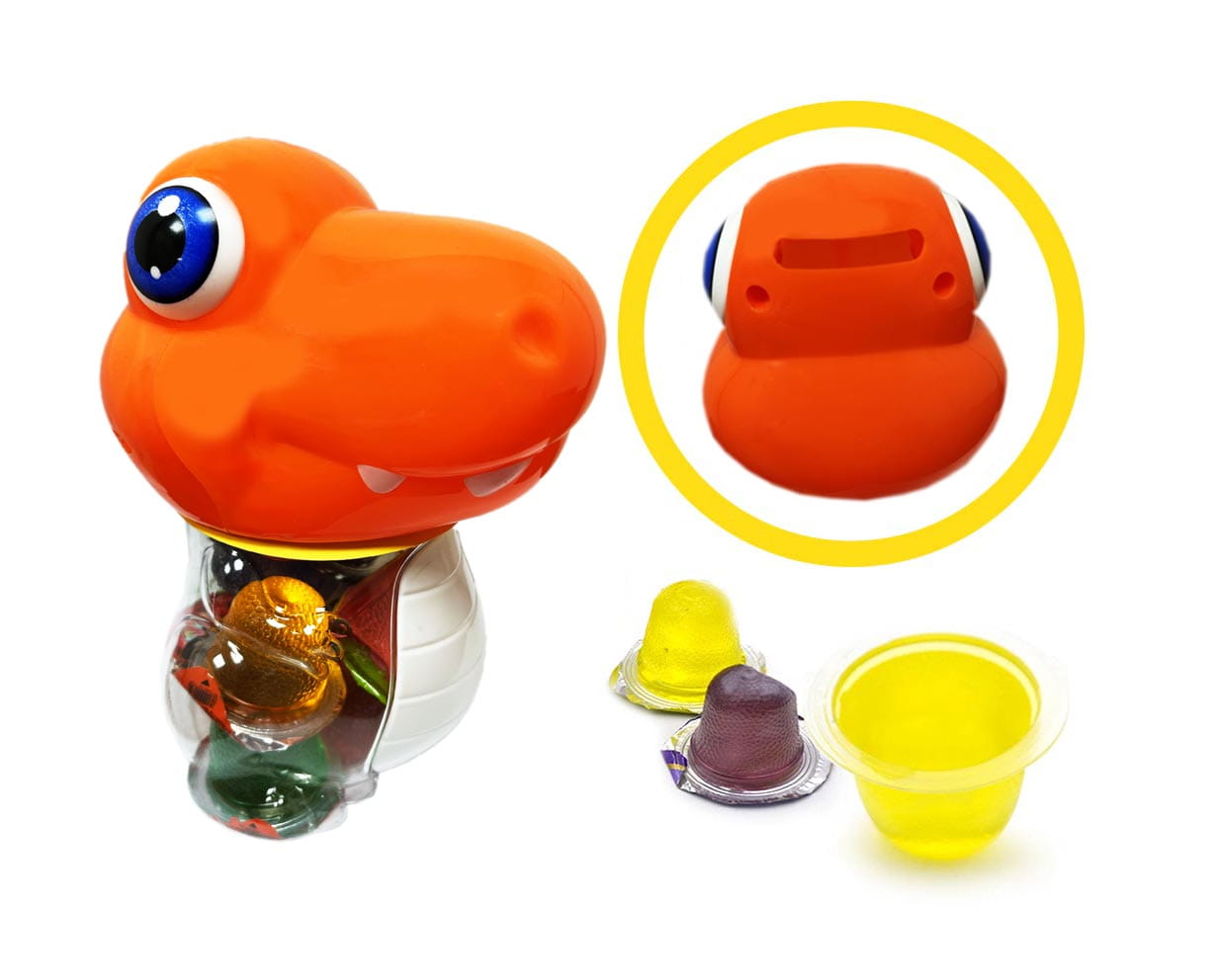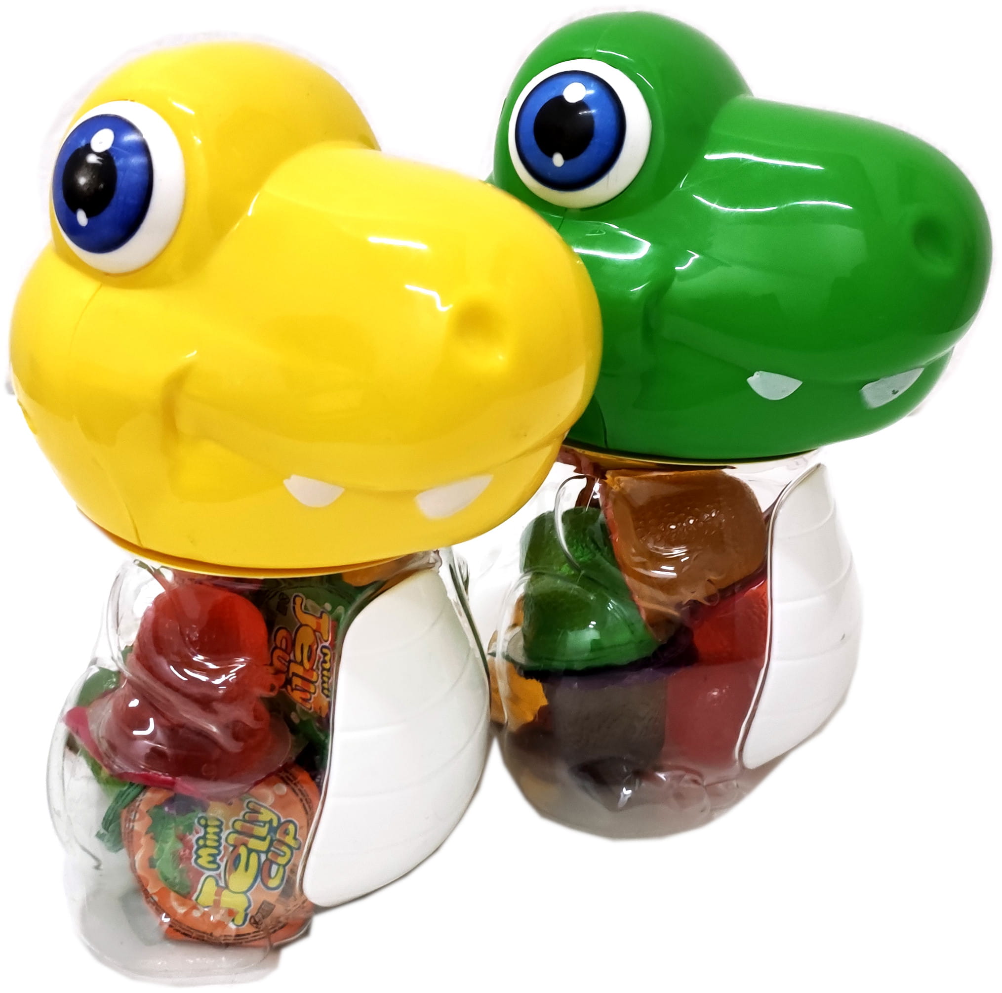 Pyszne rozpływające się w ustach żelki o smaku owocowym zamknięte w opakowaniu zbiorczym przypominającym dinozaura - skarbonkę.