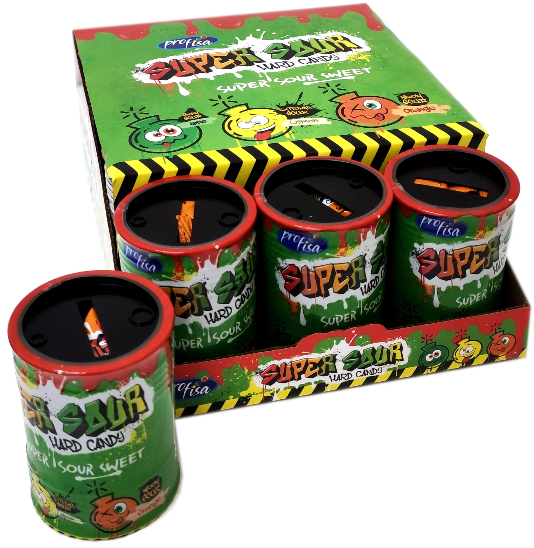 Kwaśne, twarde cukierki zamknięte w pojemniku przypominającym beczkę. Cukierki w trzech smakach: jabłko, pomarańcza i cytryna.