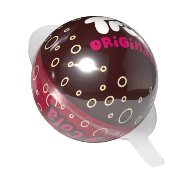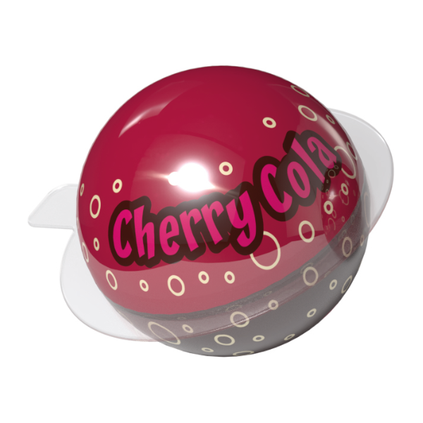 Okrągłe piankowe żelki z płynnym nadzieniem w środku o smaku wiśni i coli (10%).