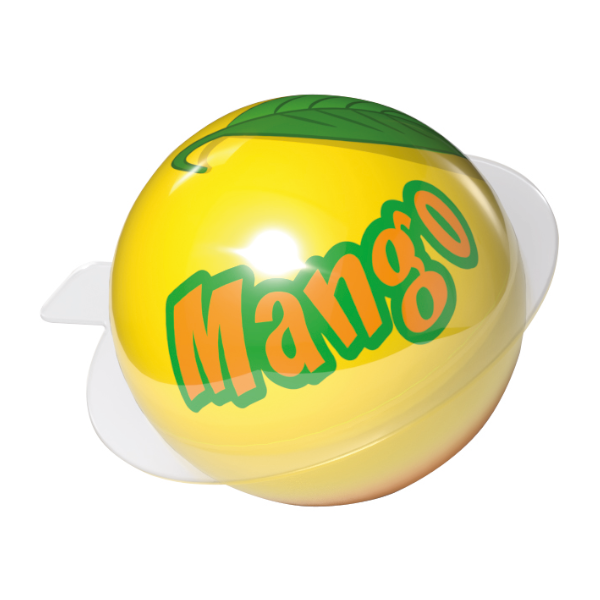 Okrągłe piankowe żelki z płynnym nadzieniem w środku o smaku mango (10%).