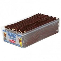 BALLA STIXX - to kolejna świetna propozycja żelek od Haribo. Żelki w kształcie kabli z nadzieniem o smaku coli. Kable są dwukolorowe ciemna brązowa otoczka oraz żółty środek. Ich intensywny zapach oraz smak sprawiają, że jest to wyjątkowa propozycja. Żelki zapakowane w prostokątne plastikowe pudełko, w środku znajdziemy 150 kabli.